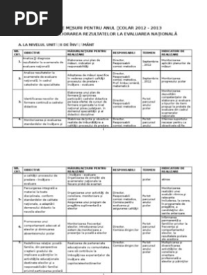 Plan De Măsuri Privind Ameliorarea Rezultatelor La Evaluarea Naţională
